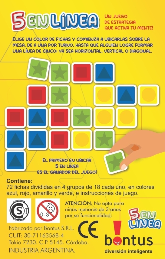 Elige un color de fichas y comienza a ubicarlas sobre la mesa, de a una por turno, hasta que alguien logre formar una línea de cinco: ya sea horizontal, vertical o diagonal.